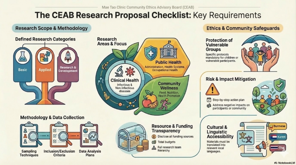 This document is a formal application template used by the Community Ethics Advisory Board at the Mae Tao Clinic to evaluate proposed scientific studies. It requires investigators to provide comprehensive identification details, including their institutional affiliations, funding sources, and specific research categories. The form places a heavy emphasis on ethical safeguards, asking for detailed plans regarding informed consent, the protection of vulnerable participants, and the mitigation of potential risks. Additionally, researchers must outline their methodology, data collection tools, and strategies for maintaining participant confidentiality. The application also tracks logistical needs, such as translation requirements for local languages and future publication intentions. Ultimately, this document serves as a compliance agreement to ensure all projects align with established community ethical guidelines.