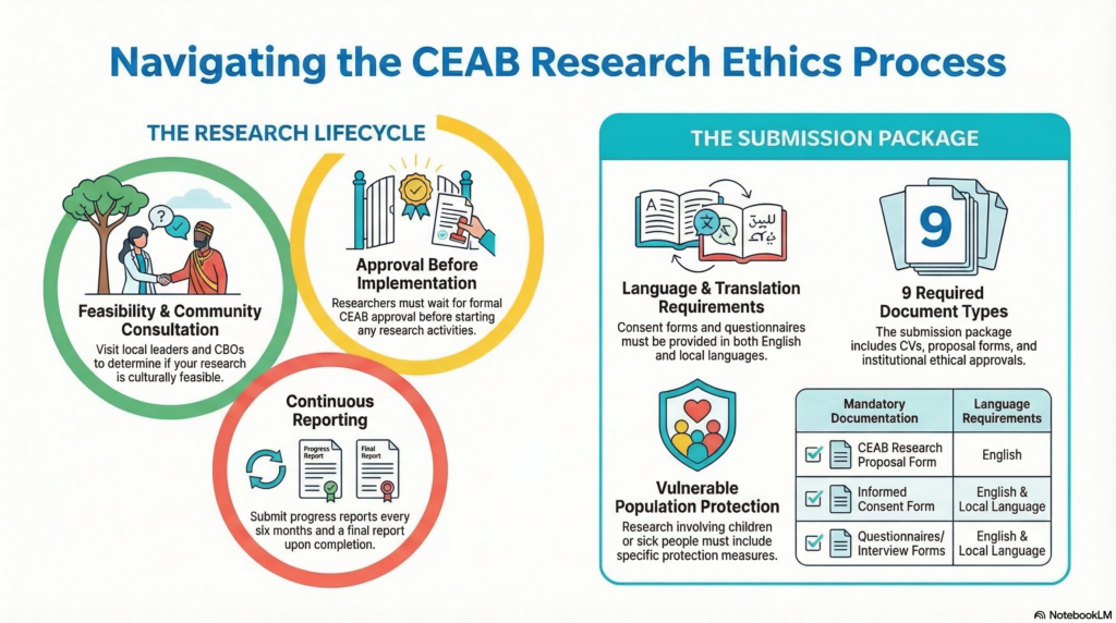 The provided document outlines the mandatory protocols and ethical requirements for investigators conducting research involving human participants through the Community Ethics Advisory Board (CEAB). This governing body, composed of local community leaders and service providers, ensures that all academic inquiries respect the cultural context and protect vulnerable populations within their jurisdiction. Researchers must secure formal approval before beginning their work and are required to provide consistent progress updates and final results to the board. The guidelines emphasize community engagement, requiring that all participant-facing materials be translated into local languages for clarity and transparency. Furthermore, the source details a comprehensive submission package that includes legal permissions, research tools, and credentials to verify the study’s integrity. Ultimately, these rules prioritize local collaboration and ethical accountability to ensure that research benefits and protects the community involved.